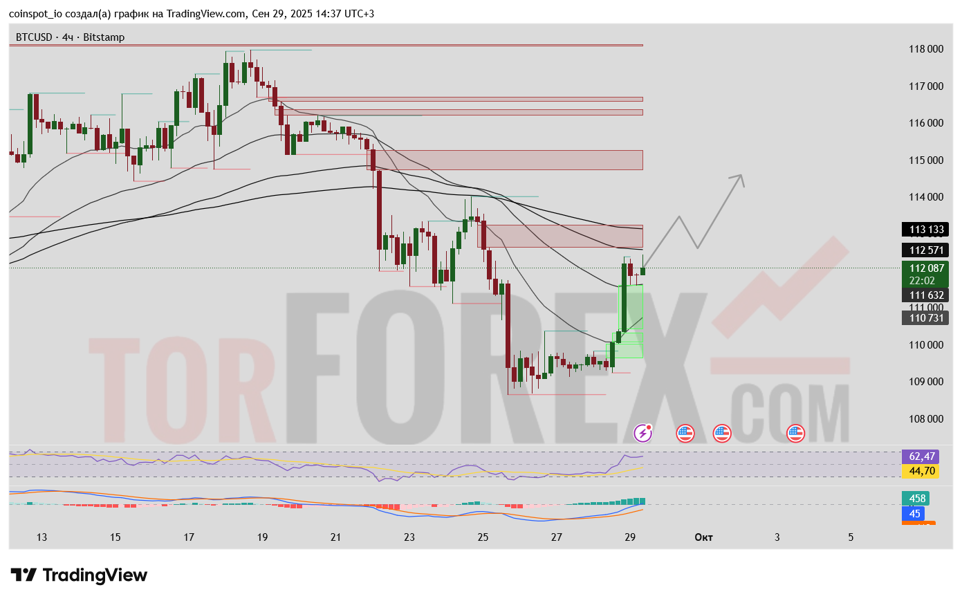 Медвежий сценарий: Вступает в силу при потере уровня $111,631 и пробое поддержки $110,720. В этом случае вероятно тестирование более глубоких уровней в зоне $109,000-$108,000. Сигналом к усилению продаж станет формирование нисходящей модели на подходах к сопротивлению $113,183.