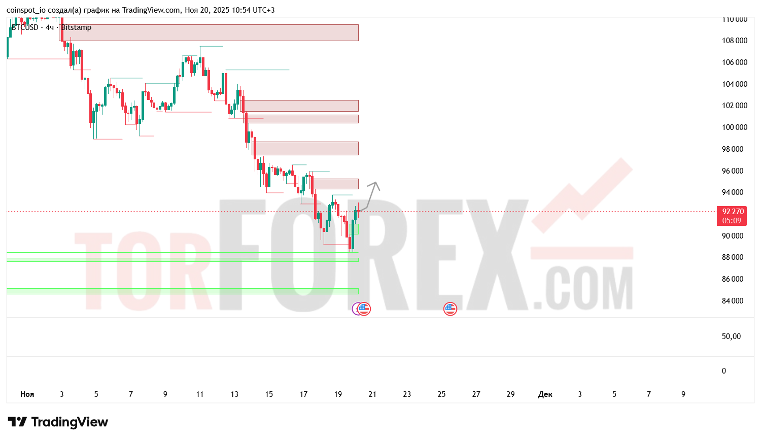 На 21 ноября 2025 года пара BTC/USD демонстрирует признаки коррекционного роста. Основной сценарий — движение к 93 400 и 94 800 USD. Торговая идея: открытие длинных позиций при закреплении выше 92 500 USD, с стоп-лоссом ниже 91 000 USD. Альтернативный сценарий — шорт при отказе от 93 400 USD, с целями 90 500 и 89 000 USD, и стоп-лоссом выше 94 000 USD.
