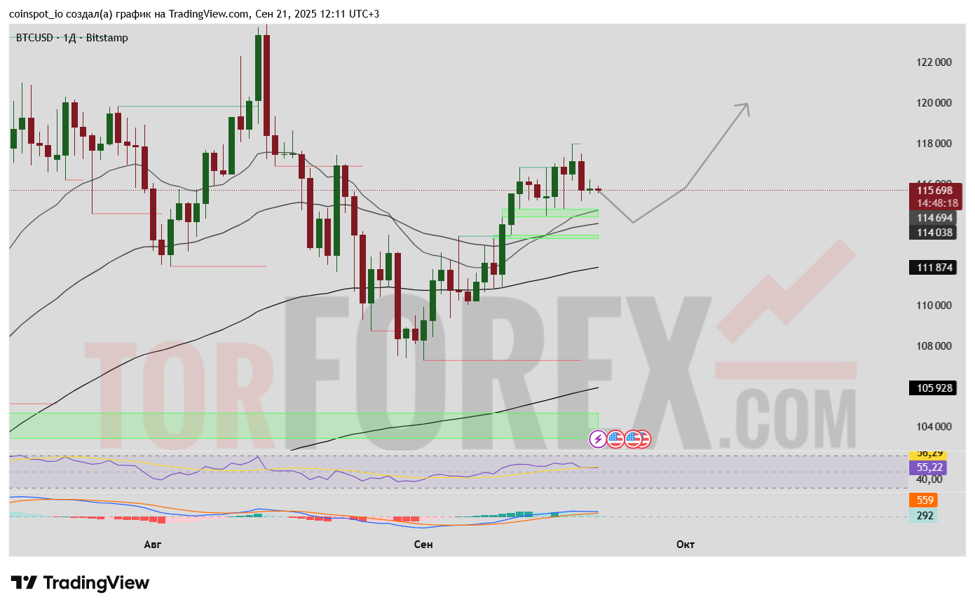Основное сопротивление — локальный максимум 115 700. Успешный пробой этого уровня станет сильным сигналом для продолжения роста.