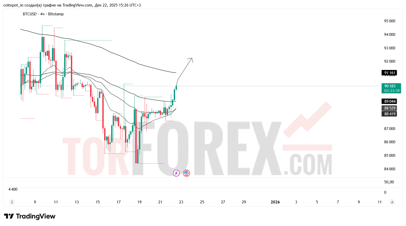 На 23 декабря 2025 года BTC/USD демонстрирует устойчивый восходящий импульс. Основной сценарий — рост к 91 160–92 500 USD при пробое EMA 200. Альтернативный сценарий — снижение к 86 069–84 500 USD при отказе от уровня 90 600 USD.