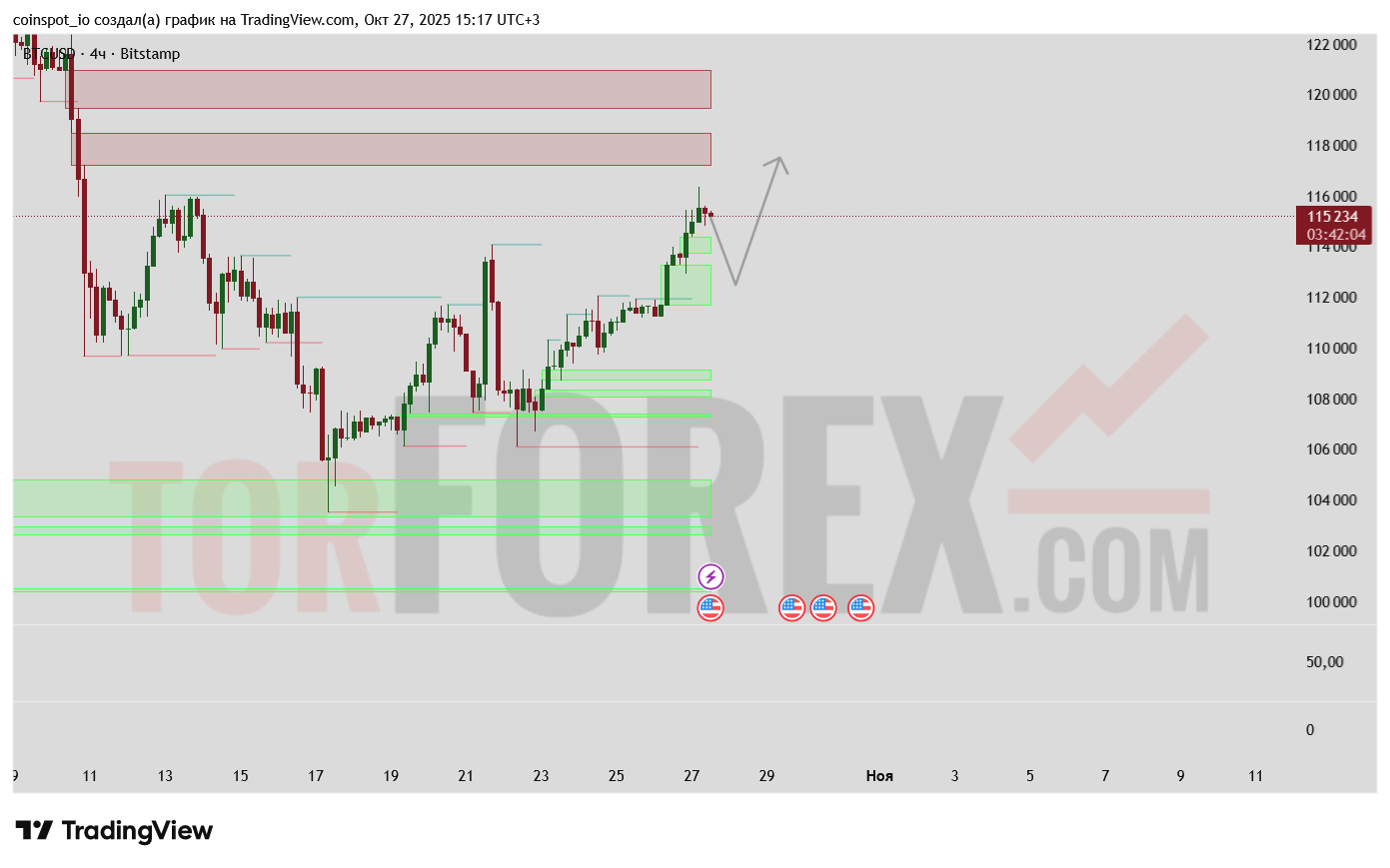 При сохранении текущего импульса и отсутствии дивергенций на RSI, наиболее вероятным сценарием является движение цены в зону 116 000 – 120 000 USD, где расположена ключевая FVG-зона. Здесь возможно частичное снятие ликвидности и начало локальной коррекции.