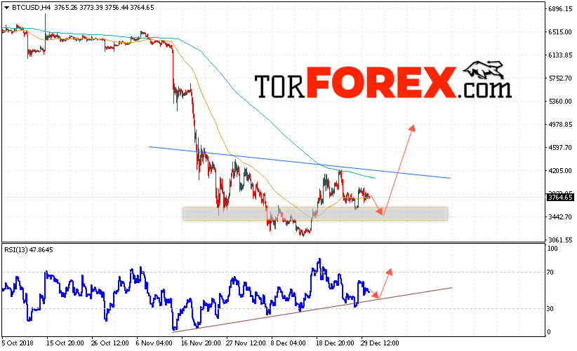 Таким образом, BTC/USD прогноз курса Bitcoin на 1 января 2019 предполагает попытку теста уровня поддержки вблизи области 3450. И далее продолжение роста криптовалюты с потенциальной целью на уровне 4970. Дополнительным сигналом в пользу роста курса Bitcoin выступит тест линии тренда на индикаторе относительной силы. Отменой варианта роста криптовалюты станет падение и пробой области 3200.
