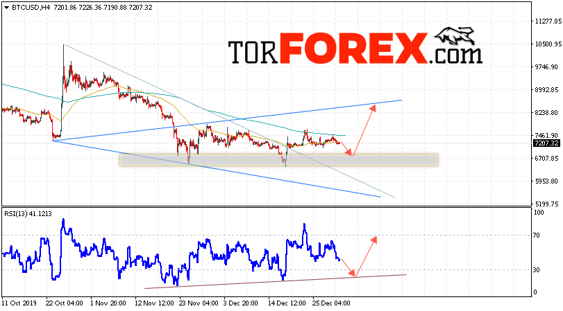 Таким образом, BTC/USD прогноз курса Bitcoin на 1 января 2020 предполагает попытку теста уровня поддержки вблизи области 6825. И далее, продолжение роста криптовалюты с потенциальной целью на уровне 8305. Дополнительным сигналом в пользу подъёма курса Bitcoin выступит тест линии поддержки на индикаторе относительной силы. Отменой варианта роста криптовалюты станет падение и пробой области 6375. Это укажет на продолжение снижения с потенциальной целью ниже области 5455.