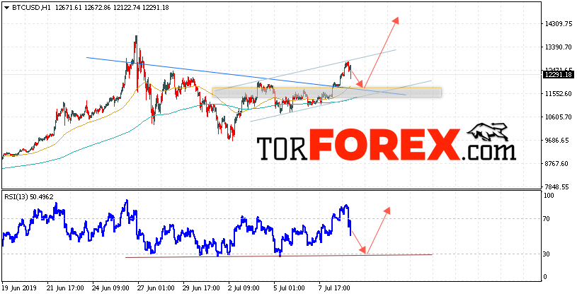 Таким образом, BTC/USD прогноз курса Bitcoin на 10 июля 2019 предполагает попытку теста уровня поддержки вблизи области 11850. И далее продолжение роста криптовалюты с потенциальной целью на уровне 14350. Дополнительным сигналом в пользу снижения курса Bitcoin выступит тест нисходящей линии тренда на индикаторе относительной силы. Отменой варианта падения криптовалюты станет сильный рост и пробой области 10650. Это укажет на продолжение подъёма с потенциальной целью выше 9450.