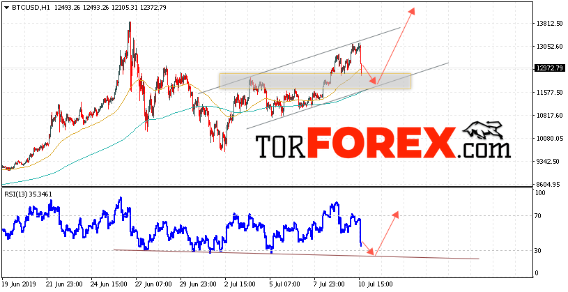 Таким образом, BTC/USD прогноз курса Bitcoin на 11 июля 2019 предполагает попытку теста уровня поддержки вблизи области 11750. И далее продолжение роста криптовалюты с потенциальной целью на уровне 14450. Дополнительным сигналом в пользу снижения курса Bitcoin выступит тест нисходящей линии тренда на индикаторе относительной силы. Отменой варианта падения криптовалюты станет сильный рост и пробой области 11150. Это укажет на продолжение подъёма с потенциальной целью выше 9550.