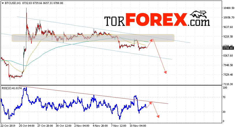 Котировки BTC/USD торгуются на уровне 8708 и продолжают движение в рамках снижения и нисходящего канала. Капитализация криптовалюты Bitcoin в момент публикации прогноза составляет $158 670 123 656. Скользящие средние указывают на наличие краткосрочной медвежьей тенденции по Bitcoin. В рамках прогноза курса криптовалюты на завтра 13 ноября 2019 стоит ожидать попытку роста цифрового актива и тест уровня сопротивления вблизи области 9105. Откуда вновь стоит ожидать отскок и попытку продолжение падения курса Bitcoin с целью ниже области 7525.