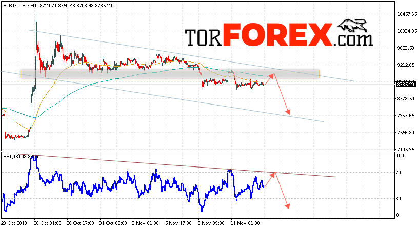 Котировки BTC/USD торгуются на уровне 8735 и продолжают движение в рамках снижения и нисходящего канала. Капитализация криптовалюты Bitcoin в момент публикации прогноза составляет $158 727 142 463. Скользящие средние указывают на наличие краткосрочной медвежьей тенденции по Bitcoin. В рамках прогноза курса криптовалюты на завтра 14 ноября 2019 стоит ожидать попытку роста цифрового актива и тест уровня сопротивления вблизи области 9055. Откуда вновь стоит ожидать отскок и попытку продолжение падения курса Bitcoin с целью ниже области 7965.