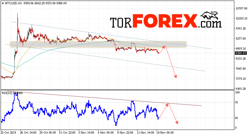 Котировки BTC/USD торгуются на уровне 8588 и продолжают движение в рамках снижения и нисходящего канала. Капитализация криптовалюты Bitcoin в момент публикации прогноза составляет $157 517 288 607. Скользящие средние указывают на наличие краткосрочной медвежьей тенденции по Bitcoin. В рамках прогноза курса криптовалюты на завтра 15 ноября 2019 стоит ожидать попытку роста цифрового актива и тест уровня сопротивления вблизи области 8905. Откуда вновь стоит ожидать отскок и попытку продолжение падения курса Bitcoin с целью ниже области 7385.