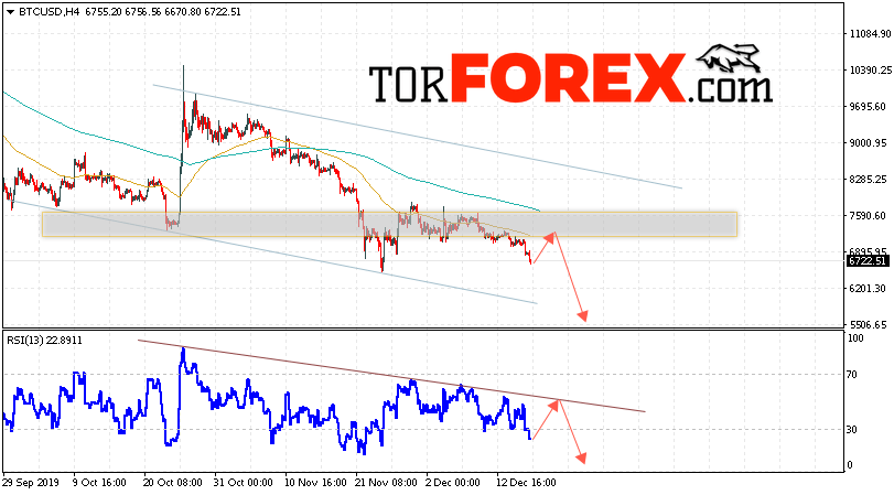 Таким образом, BTC/USD прогноз курса Bitcoin на 18 декабря 2019 предполагает попытку теста уровня сопротивления вблизи области 7045. И далее, продолжение падения криптовалюты с потенциальной целью на уровне 5525. Дополнительным сигналом в пользу снижения курса Bitcoin выступит тест линии сопротивления на индикаторе относительной силы. Отменой варианта падения криптовалюты станет сильный рост и пробой области 8200. Это укажет на продолжение роста с потенциальной целью выше области 8755.
