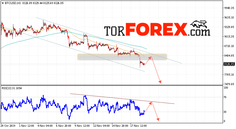Котировки BTC/USD торгуются на уровне 8126 и продолжают движение в рамках снижения и нисходящего канала. Капитализация криптовалюты Bitcoin в момент публикации прогноза составляет $147 785 733 728. Скользящие средние указывают на наличие краткосрочной медвежьей тенденции по Bitcoin. В рамках прогноза курса криптовалюты на завтра 20 ноября 2019 стоит ожидать попытку роста цифрового актива и тест уровня сопротивления вблизи области 8305. Откуда вновь стоит ожидать отскок и попытку продолжение падения курса Bitcoin с целью ниже области 7475.