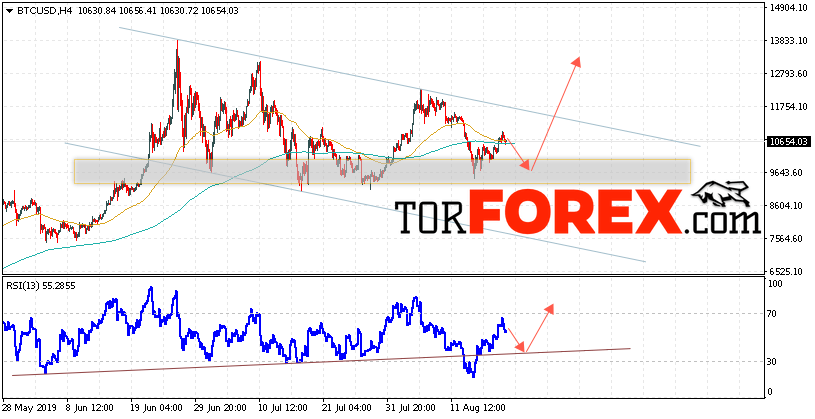 Таким образом, BTC/USD прогноз курса Bitcoin на 21 августа 2019 предполагает попытку теста уровня поддержки вблизи области 9705. И далее продолжение роста криптовалюты с потенциальной целью на уровне 13055. Дополнительным сигналом в пользу роста курса Bitcoin выступит тест области поддержки на индикаторе относительной силы. Отменой варианта роста криптовалюты станет падение и пробой области 8750. Это укажет на продолжение снижения с потенциальной целью ниже 7950.