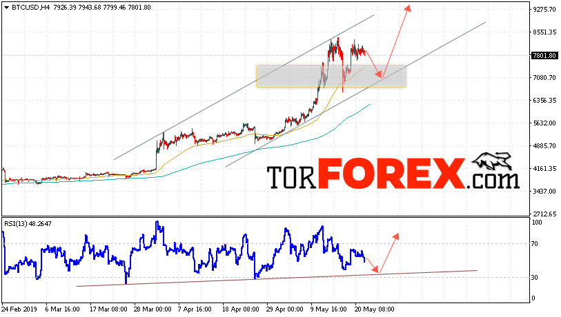 Таким образом, BTC/USD прогноз курса Bitcoin на 23 мая 2019 предполагает попытку теста уровня поддержки вблизи области 7205. И далее продолжение роста криптовалюты с потенциальной целью на уровне 9275. Дополнительным сигналом в пользу подъёма курса Bitcoin выступит тест восходящей линии тренда на индикаторе относительной силы. Отменой варианта роста криптовалюты станет падение и пробой области 6825. Это укажет на продолжение снижения с потенциальной целью ниже 6250.