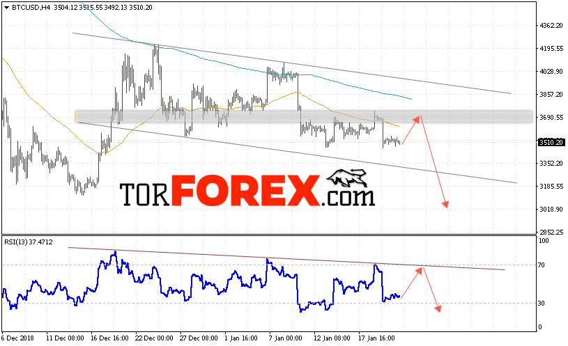 Таким образом, BTC/USD прогноз курса Bitcoin на 23 января 2019 предполагает попытку теста уровня сопротивления вблизи области 3690. И далее продолжение падения криптовалюты с потенциальной целью на уровне 3020. Дополнительным сигналом в пользу снижения курса Bitcoin выступит тест формирования разворотной модели на индикаторе относительной силы. Отменой варианта падения криптовалюты станет рост и пробой области 3880. Это укажет на продолжение роста с потенциальной целью выше 4350.
