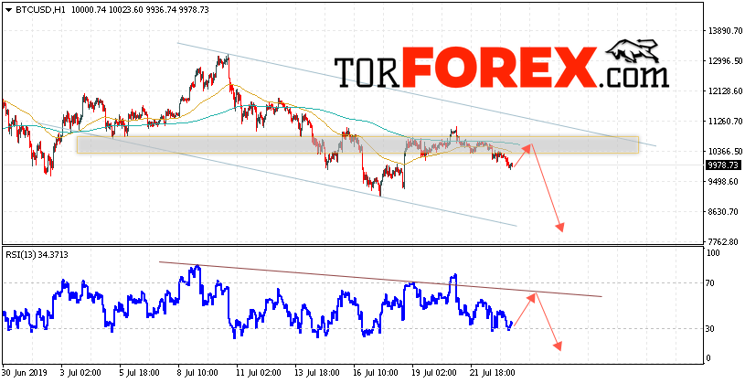 Таким образом, BTC/USD прогноз курса Bitcoin на 24 июля 2019 предполагает попытку теста уровня сопротивления вблизи области 10350. И далее продолжение падения криптовалюты с потенциальной целью на уровне 7850. Дополнительным сигналом в пользу снижения курса Bitcoin выступит тест нисходящей линии тренда на индикаторе относительной силы. Отменой варианта снижения криптовалюты станет сильный рост и пробой области 11400. Это укажет на продолжение подъёма с потенциальной целью выше 11900.