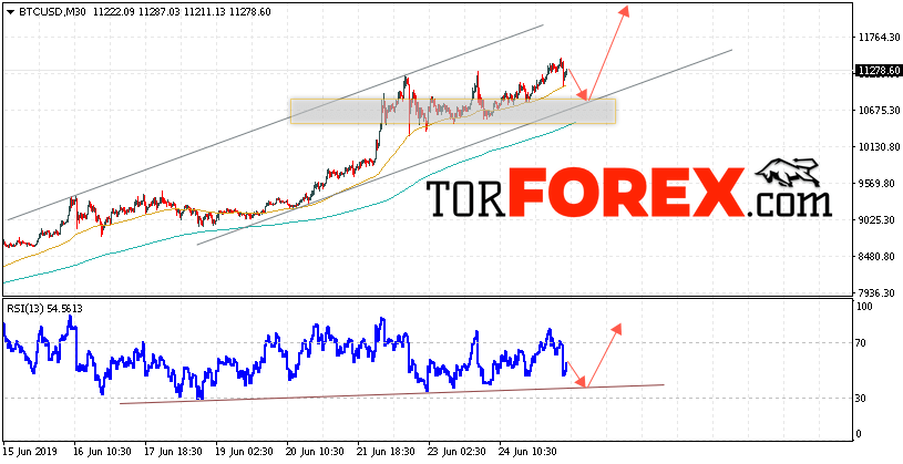 Таким образом, BTC/USD прогноз курса Bitcoin на 26 июня 2019 предполагает попытку теста уровня поддержки вблизи области 10785. И далее продолжение роста криптовалюты с потенциальной целью на уровне 12275. Дополнительным сигналом в пользу подъёма курса Bitcoin выступит тест восходящей линии тренда на индикаторе относительной силы. Отменой варианта роста криптовалюты станет падение и пробой области 9965. Это укажет на продолжение снижения с потенциальной целью ниже 8650.