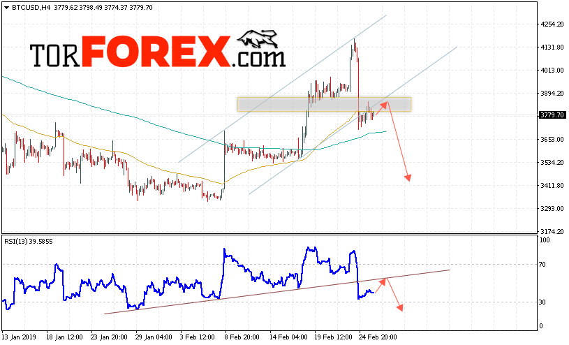 Таким образом, BTC/USD прогноз курса Bitcoin на 27 февраля 2019 предполагает попытку теста уровня сопротивления вблизи области 3820. И далее продолжение падения криптовалюты с потенциальной целью на уровне 3410. Дополнительным сигналом в пользу снижения курса Bitcoin выступит тест пробитой линии тренда на индикаторе относительной силы. Отменой варианта падения криптовалюты станет сильный рост и пробой области 3965. Это укажет на продолжение подъёма с потенциальной целью выше 4150.