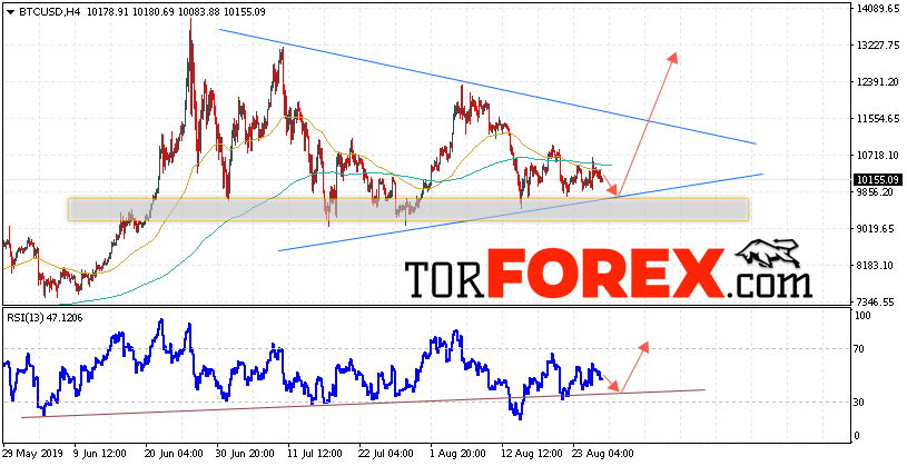 Таким образом, BTC/USD прогноз курса Bitcoin на 28 августа 2019 предполагает попытку теста уровня поддержки вблизи области 9765. И далее продолжение роста криптовалюты с потенциальной целью на уровне 13250. Дополнительным сигналом в пользу роста курса Bitcoin выступит тест области поддержки на индикаторе относительной силы. Отменой варианта роста криптовалюты станет падение и пробой области 8805. Это укажет на продолжение снижения с потенциальной целью ниже 7705.