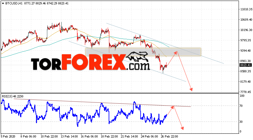 Дополнительным сигналом в пользу падения котировок BTC/USD выступит тест нисходящей линии тренда на индикаторе относительной силы. Вторым сигналом станет отскок от верхней границы нисходящего канала. Отменой варианта падения курса Bitcoin станет сильный рост и пробой области 9715. Это укажет на пробой верхней границы канала и продолжение роста курса Bitcoin с потенциальной целью на уровне 10505. С пробоем области поддержки и закрытием котировок криптовалюты ниже уровня 8305 стоит ожидать подтверждения снижения курса цифрового актива.