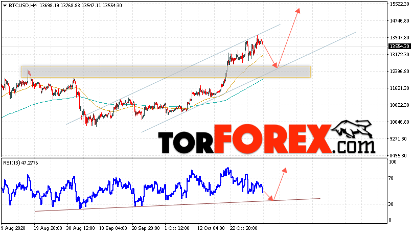 Дополнительным сигналом в пользу роста котировок BTC/USD выступит тест линии тренда на индикаторе относительной силы. Вторым сигналом станет отскок нижней границы восходящего канала. Отменой варианта подъёма курса и стоимости Bitcoin станет падение стоимости актива и пробой области 11755. Это укажет на пробой области поддержки и продолжение падения курса Bitcoin с потенциальной целью на уровне 11055. С пробоем области сопротивления и закрытием котировок криптовалюты выше уровня 14245.