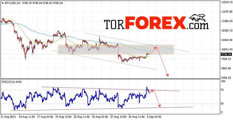 В пользу снижения котировок BTC/USD выступит тест линии сопротивления на индикаторе относительной силы. Вторым сигналом станет отскок от верхней границы нисходящего канала. Отменой варианта снижения курса Bitcoin станет сильный рост и пробой области 10325. Это укажет на пробой области сопротивления и продолжение подъёма курса Bitcoin с потенциальной целью на уровне 11055. С пробоем области поддержки и закрытием котировок криптовалюты ниже уровня 9055 стоит ожидать подтверждения падения курса цифрового актива.
