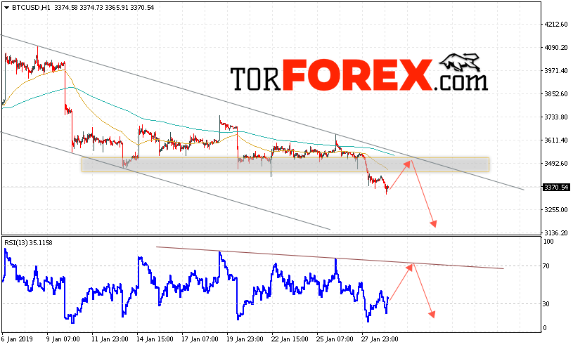 Таким образом, BTC/USD прогноз курса Bitcoin на 30 января 2019 предполагает попытку теста уровня сопротивления вблизи области 3490. И далее продолжение падения криптовалюты с потенциальной целью на уровне 3135. Дополнительным сигналом в пользу снижения курса Bitcoin выступит тест формирования разворотной модели на индикаторе относительной силы. Отменой варианта падения криптовалюты станет рост и пробой области 3650. Это укажет на продолжение роста с потенциальной целью выше 4155.