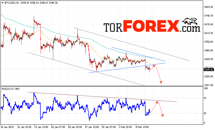 Таким образом, BTC/USD прогноз курса Bitcoin на 7 февраля 2019 предполагает попытку теста уровня сопротивления вблизи области 3405. И далее продолжение падения криптовалюты с потенциальной целью на уровне 3250. Дополнительным сигналом в пользу снижения курса Bitcoin выступит тест формирования разворотной модели на индикаторе относительной силы. Отменой варианта падения криптовалюты станет рост и пробой области 3500. Это укажет на продолжение роста с потенциальной целью выше 3900.