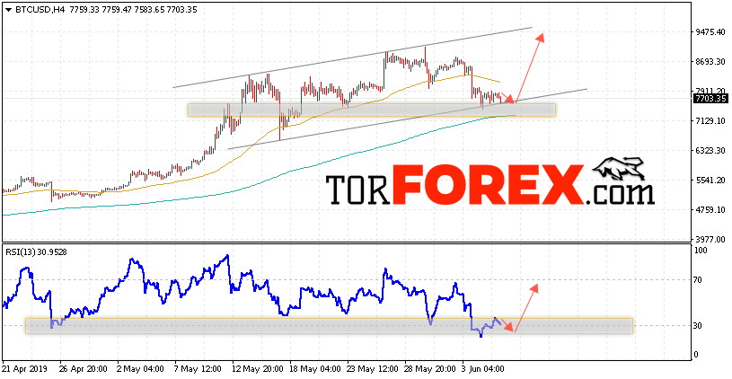 Таким образом, BTC/USD прогноз курса Bitcoin на 7 июня 2019 предполагает попытку теста уровня поддержки вблизи области 7565. И далее продолжение роста криптовалюты с потенциальной целью на уровне 9475. Дополнительным сигналом в пользу подъёма курса Bitcoin выступит тест восходящей линии тренда на индикаторе относительной силы. Отменой варианта роста криптовалюты станет падение и пробой области 7135. Это укажет на продолжение снижения с потенциальной целью ниже 6765.