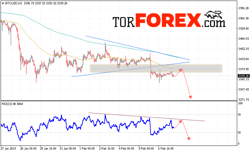 Таким образом, BTC/USD прогноз курса Bitcoin на 8 февраля 2019 предполагает попытку теста уровня сопротивления вблизи области 3385. И далее продолжение падения криптовалюты с потенциальной целью на уровне 3275. Дополнительным сигналом в пользу снижения курса Bitcoin выступит тест формирования разворотной модели на индикаторе относительной силы. Отменой варианта падения криптовалюты станет рост и пробой области 3450. Это укажет на продолжение роста с потенциальной целью выше 3800.