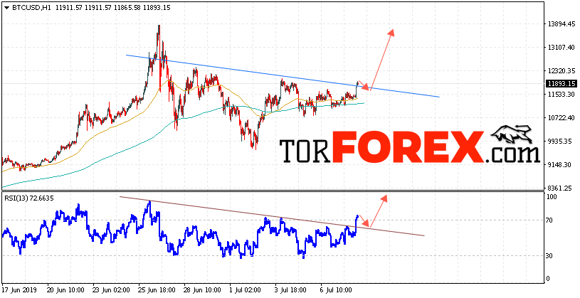Таким образом, BTC/USD прогноз курса Bitcoin на 9 июля 2019 предполагает попытку теста уровня поддержки вблизи области 11520. И далее продолжение роста криптовалюты с потенциальной целью на уровне 14050. Дополнительным сигналом в пользу снижения курса Bitcoin выступит тест нисходящей линии тренда на индикаторе относительной силы. Отменой варианта падения криптовалюты станет сильный рост и пробой области 10500. Это укажет на продолжение подъёма с потенциальной целью выше 9250.