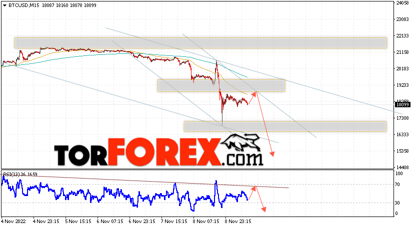 Котировки BTC/USD торгуются на уровне 18099 и продолжают движение в рамках развития падения и нисходящего канала. Капитализация криптовалюты Биткоин в момент публикации прогноза составляет $345,206,396,152. Скользящие средние указывают на наличие краткосрочной медвежьей тенденции по Bitcoin. Цены пробили область между сигнальными линиями вниз, что указывает на давление со стороны продавцов ”Цифрового Золота” и потенциальное продолжение снижения стоимости актива уже с текущих уровней. В рамках прогноза курса криптовалюты на завтра 10 ноября 2022 стоит ожидать попытку развития подъёма стоимости цифрового актива и тест уровня сопротивления вблизи области 18505. Откуда вновь стоит ожидать отскок вниз и попытку продолжения падения курса Bitcoin с целью ниже области 15205.