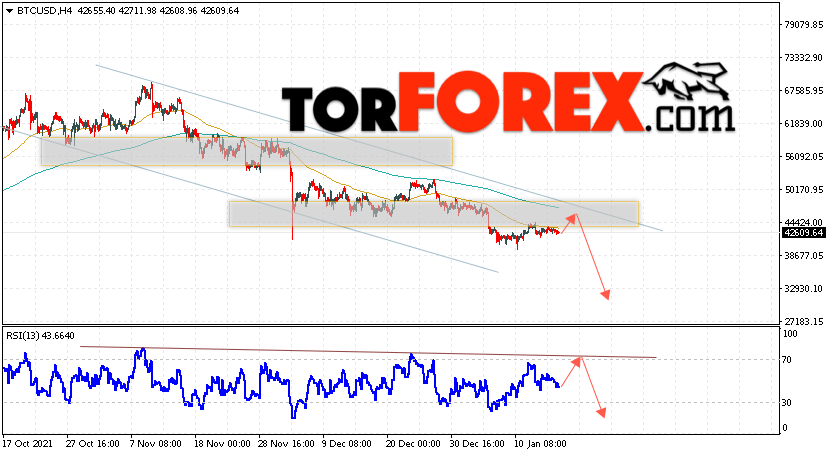 Котировки BTC/USD торгуются на уровне 42609 и продолжают движение в рамках коррекции и нисходящего канала. Капитализация криптовалюты Биткоин в момент публикации прогноза составляет $809,071,462,741. Скользящие средние указывают на наличие краткосрочной медвежьей тенденции по Bitcoin. Цены ушли вниз от области между сигнальными линиями, что указывает на давление со стороны продавцов ”Цифрового Золота” и потенциальное продолжение падения стоимости актива уже с текущих уровней. В рамках прогноза курса криптовалюты на завтра 18 января 2022 стоит ожидать попытку развития коррекции стоимости цифрового актива и тест уровня сопротивления вблизи области 45055. Откуда вновь стоит ожидать отскок вниз и попытку продолжения падения курса Bitcoin с целью ниже области 31505.