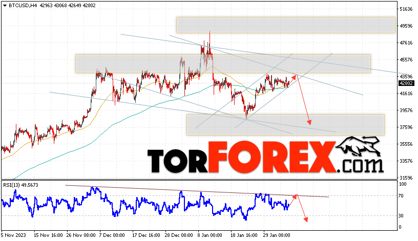 Дополнительным сигналом в пользу падения котировок BTC/USD выступит тест линии сопротивления на индикаторе относительной силы. Вторым сигналом в пользу этого варианта станет отскок от верхней границы медвежьего канала. Отменой варианта снижения курса монеты и стоимости Bitcoin станет сильный рост стоимости актива и пробой области 46005. Это укажет на пробой области сопротивления и продолжение роста курса Bitcoin с потенциальной целью на уровне 49805. Подтверждением падению цены актива выступит пробой области поддержки с закреплением цены ниже уровня 39405, что укажет на пробой нижней границы бычьего канала.