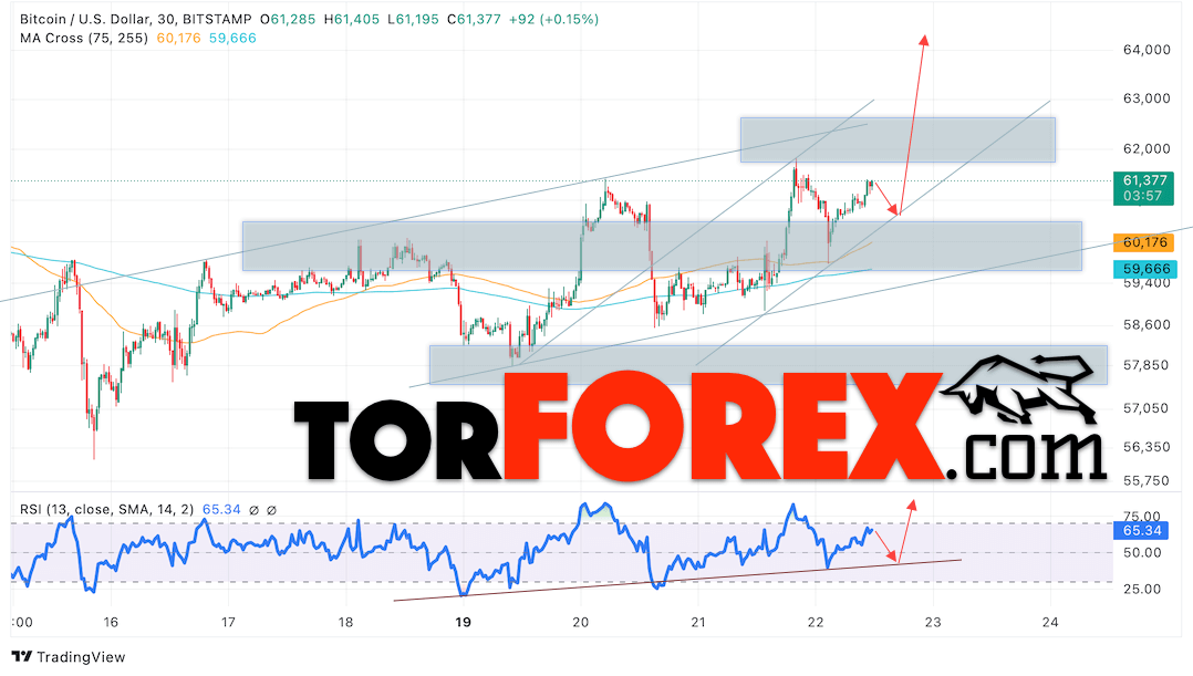 Дополнительным сигналом в пользу подъёма котировок BTC/USD выступит тест линии поддержки на индикаторе относительной силы. Вторым сигналом в пользу этого варианта станет отскок от нижней границы бычьего канала. Отменой варианта подъёма курса монеты и стоимости Bitcoin станет падение стоимости актива и пробой области 59305. Это укажет на пробой области поддержки и продолжение падения курса Bitcoin с потенциальной целью на уровне 56605. Подтверждением росту цены актива выступит пробой области сопротивления с закреплением цены выше отметки 62205.