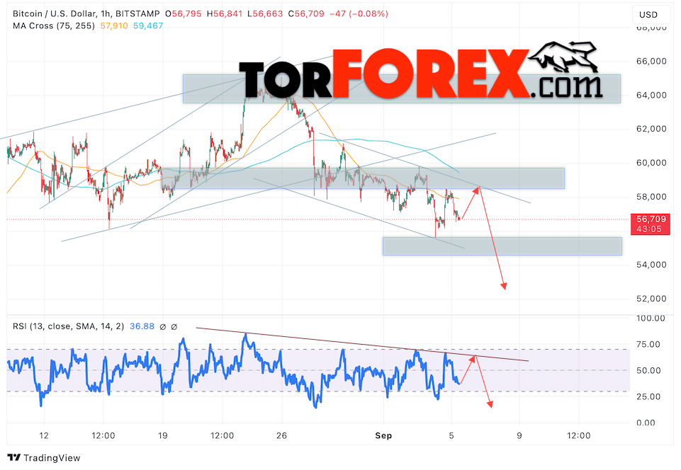 Котировки BTC/USD торгуются на уровне 56709 и продолжают движение в рамках развития падения и медвежьего канала. Скользящие средние указывают на наличие краткосрочной нисходящей тенденции по Bitcoin. Цены пробили область между сигнальными линиями вниз, что указывает на давление со стороны продавцов «Цифрового Золота» и потенциальное продолжение падения стоимости актива уже с текущих уровней. В рамках прогноза курса криптовалюты на завтра 6 сентября 2024 стоит ожидать попытку развития роста стоимости цифрового актива и тест уровня сопротивления вблизи области 58045. Откуда вновь стоит ожидать отскок вниз и попытку продолжения падения курса Bitcoin с целью ниже области 52365.