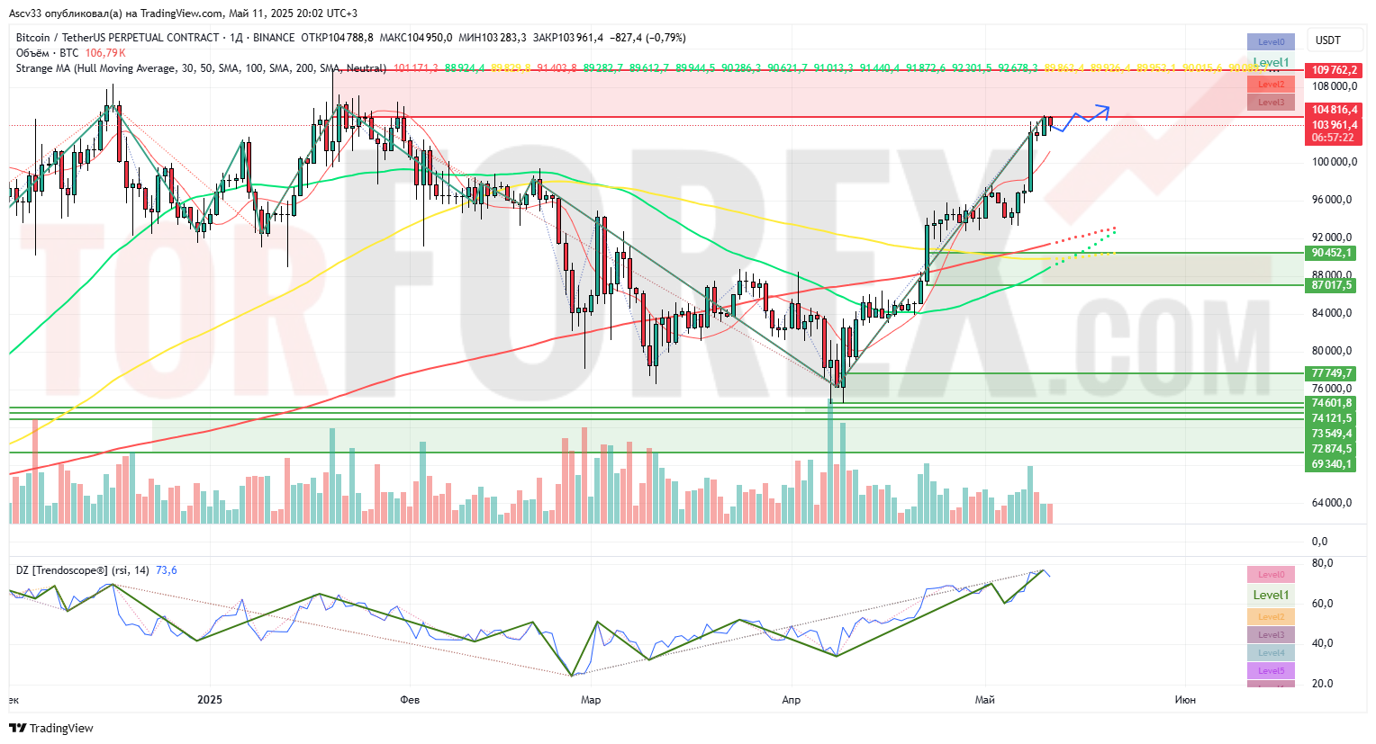 Если BTC удержится выше 100 000 и пробьёт 104 800, с фиксацией выше 108 000, это откроет путь к 110 000 и выше. Поддержкой в таком сценарии выступит уровень 100 000.