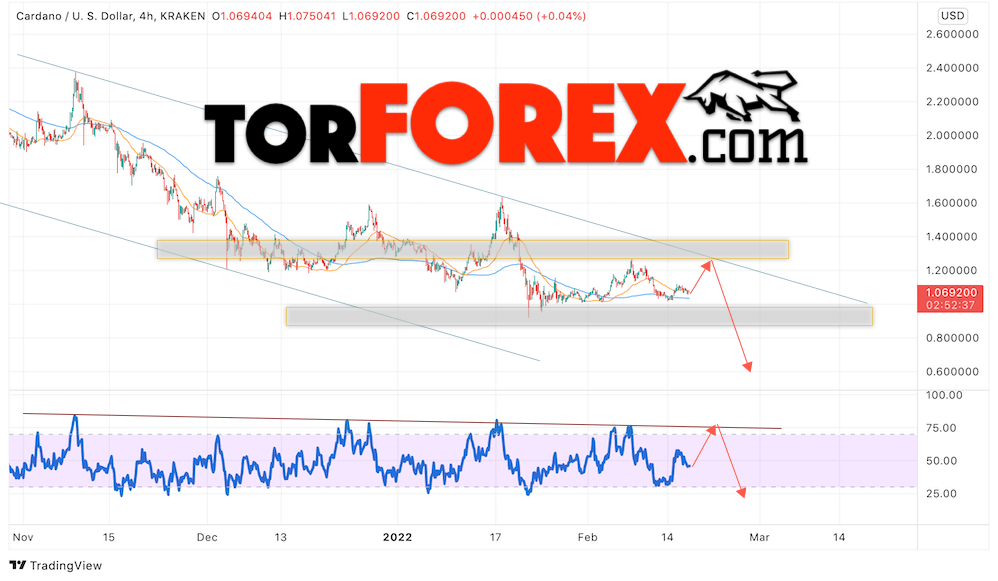 Таким образом, Cardano прогноз на 18 февраля 2022 предполагает попытку коррекции и тест области сопротивления вблизи уровня 1.20. Откуда стоит ожидать отскок и продолжения падения ADA/USD в область ниже уровня 0.60. Дополнительным сигналом в пользу снижения Cardano выступит тест линии тренда на индикаторе относительной силы. Отменой варианта падения станет сильный рост и пробой области 1.40. Это укажет на продолжение подъёма криптовалюты с целью выше уровня 1.65.