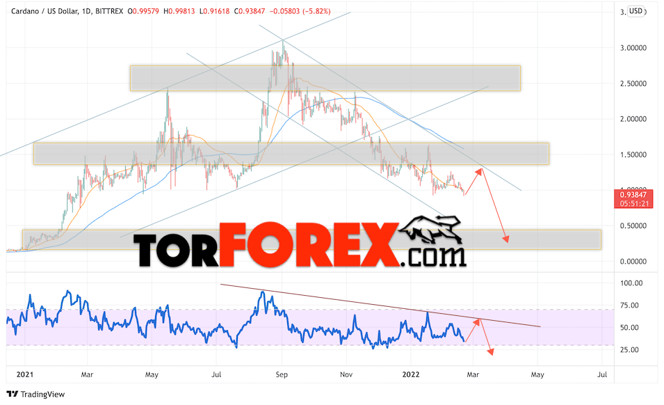 В пользу снижения котировок ADA/USD выступит тест линии тренда на индикаторе относительной силы. Вторым сигналом станет отскок от верхней границы нисходящего канала. Отменой варианта падения монеты станет сильный рост стоимости актива и пробой области 1.50. Это укажет на пробой области сопротивления и продолжение роста курса криптовалюты с потенциальной целью выше уровня 1.75. С пробоем области поддержки и закрытием котировок монеты ниже уровня 0.85 стоит ожидать подтверждения развития нисходящей тенденции по Cardano.