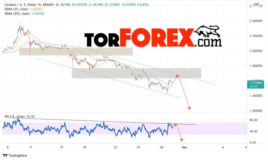 Таким образом, Cardano прогноз на 30 ноября 2021 предполагает попытку коррекции и тест области сопротивления вблизи уровня 1.61. Откуда стоит ожидать отскок и продолжения падения ADA/USD в область ниже уровня 1.20. Дополнительным сигналом в пользу снижения Cardano выступит тест линии тренда на индикаторе относительной силы. Отменой варианта падения станет сильный рост и пробой области 1.77. Это укажет на продолжение подъёма криптовалюты с целью выше уровня 2.05.
