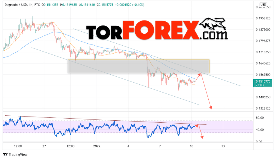 Сильный сигналом в пользу снижения котировок DOGE/USD выступит отскок от линии сопротивления на индикаторе относительной силы. Вторым сигналом станет отскок от верхней границы медвежьего канала. Отменой варианта падения монеты станет сильный рост стоимости актива и пробой области 0.1705. Это укажет на пробой области сопротивления и продолжение роста курса криптовалюты с потенциальной целью выше уровня 0.2205. С пробоем области поддержки и закрытием котировок ниже уровня 0.1405 стоит ожидать подтверждения развития медвежьей тенденции по Dogecoin.
