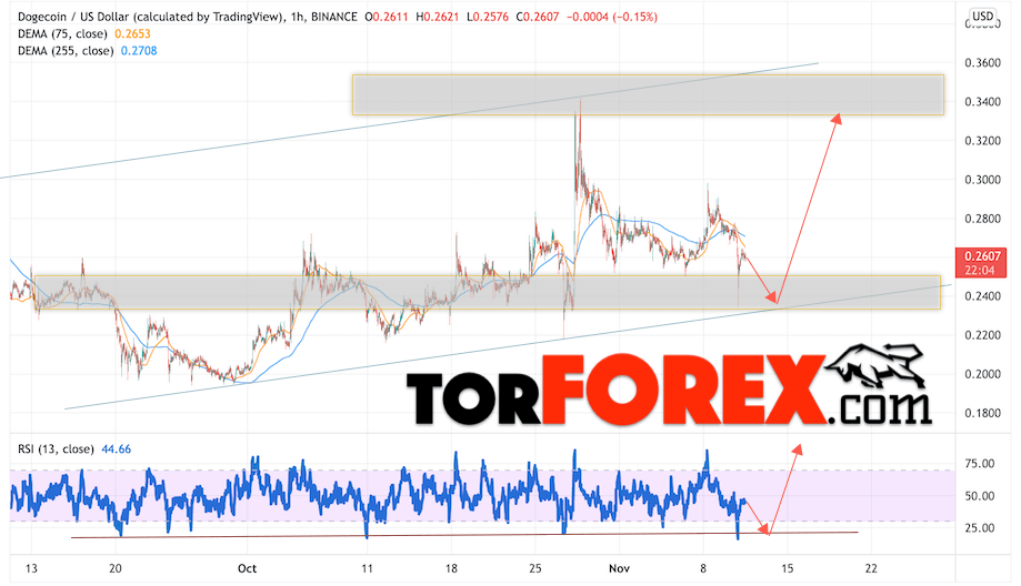 Таким образом, Dogecoin прогноз и курс на 12 ноября 2021 предполагает попытку коррекции и тест области поддержки вблизи уровня 0.2585. Откуда стоит ожидать отскок и продолжения роста DOGE/USD в область выше уровня 0.3415. Дополнительным сигналом в пользу подъёма Dogecoin выступит тест линии тренда на индикаторе относительной силы. Отменой варианта роста станет падение и пробой области 0.2125. Это укажет на продолжение снижения криптовалюты с целью ниже уровня 0.1755.
