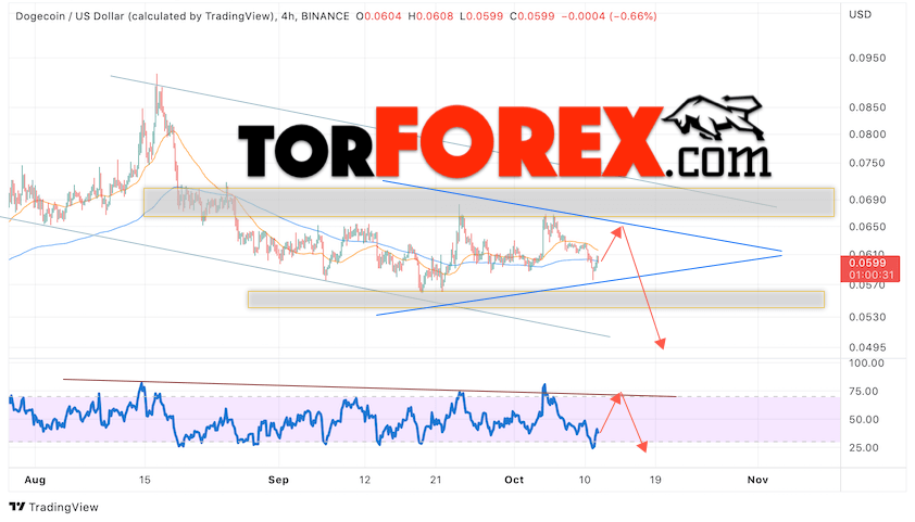 Сильный сигналом в пользу снижения котировок DOGE/USD выступит отскок от медвежьей линии тренда на индикаторе относительной силы. Вторым сигналом станет отскок от верхней границы модели ”Треугольник”. Отменой варианта снижения монеты станет сильный рост стоимости актива и пробой области 0.0725. Это укажет на пробой области сопротивления и продолжение роста курса криптовалюты с потенциальной целью выше уровня 0.0945. С пробоем области поддержки и закрытием котировок ниже уровня 0.0525 стоит ожидать подтверждения развития нисходящего импульса по Dogecoin, что укажет на пробой нижней границы модели ”Треугольник” и начало отработки паттерна с целями внизу.