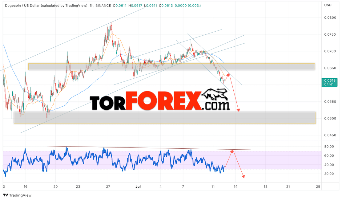 Сильный сигналом в пользу снижения котировок DOGE/USD выступит отскок от линии тренда на индикаторе относительной силы. Вторым сигналом станет отскок от верхней границы нисходящего канала. Отменой варианта падения монеты станет сильный рост стоимости актива и пробой области 0.0675. Это укажет на пробой области сопротивления и продолжение подъёма курса криптовалюты с потенциальной целью выше уровня 0.0805. С пробоем области поддержки и закрытием котировок ниже уровня 0.0575 стоит ожидать подтверждения развития медвежьего импульса по Dogecoin.