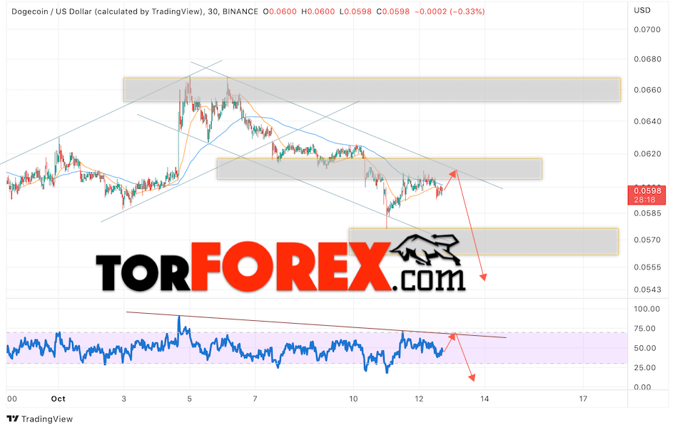 Сильный сигналом в пользу снижения котировок DOGE/USD выступит отскок от медвежьей линии тренда на индикаторе относительной силы. Вторым сигналом станет отскок от верхней границы нисходящего канала. Отменой варианта снижения монеты станет сильный рост стоимости актива и пробой области 0.0615. Это укажет на пробой области сопротивления и продолжение роста курса криптовалюты с потенциальной целью выше уровня 0.0845. С пробоем области поддержки и закрытием котировок ниже уровня 0.0525 стоит ожидать подтверждения развития нисходящего импульса по Dogecoin.