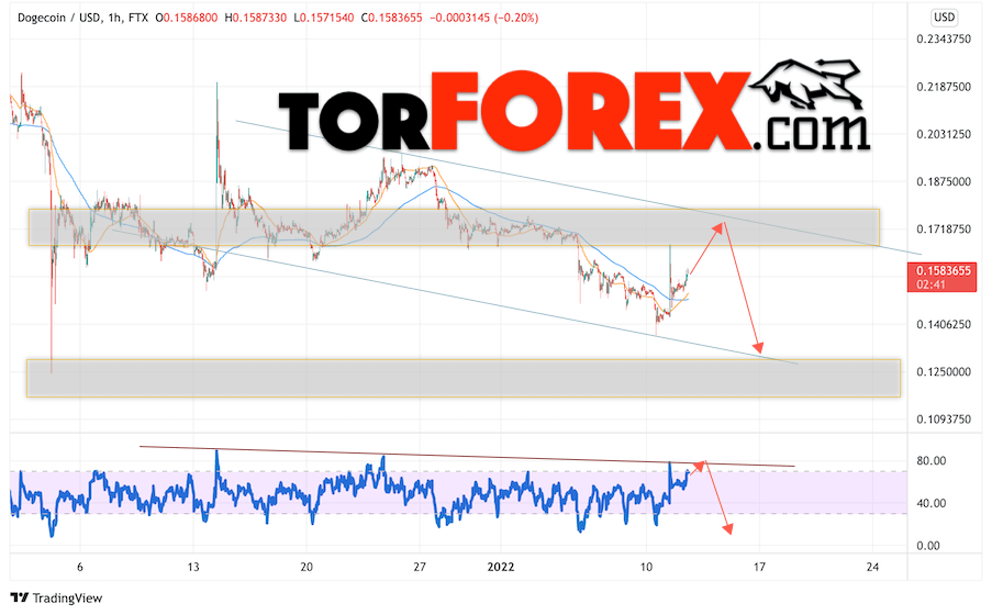 Сильный сигналом в пользу снижения котировок DOGE/USD выступит отскок от линии сопротивления на индикаторе относительной силы. Вторым сигналом станет отскок от верхней границы медвежьего канала. Отменой варианта падения монеты станет сильный рост стоимости актива и пробой области 0.1835. Это укажет на пробой области сопротивления и продолжение роста курса криптовалюты с потенциальной целью выше уровня 0.2145. С пробоем области поддержки и закрытием котировок ниже уровня 0.1405 стоит ожидать подтверждения развития медвежьей тенденции по Dogecoin.