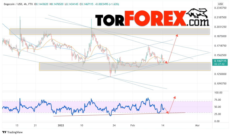 Таким образом, Dogecoin прогноз и курс на 15 февраля 2022 предполагает попытку коррекции и тест области поддержки вблизи уровня 0.1405. Откуда стоит ожидать отскок и продолжения роста DOGE/USD в область выше уровня 0.1875. Дополнительным сигналом в пользу роста Dogecoin выступит тест линии тренда на индикаторе относительной силы. Отменой варианта подъёма станет падение и пробой области 0.1285. Это укажет на продолжение падения криптовалюты с целью ниже уровня 0.1075.
