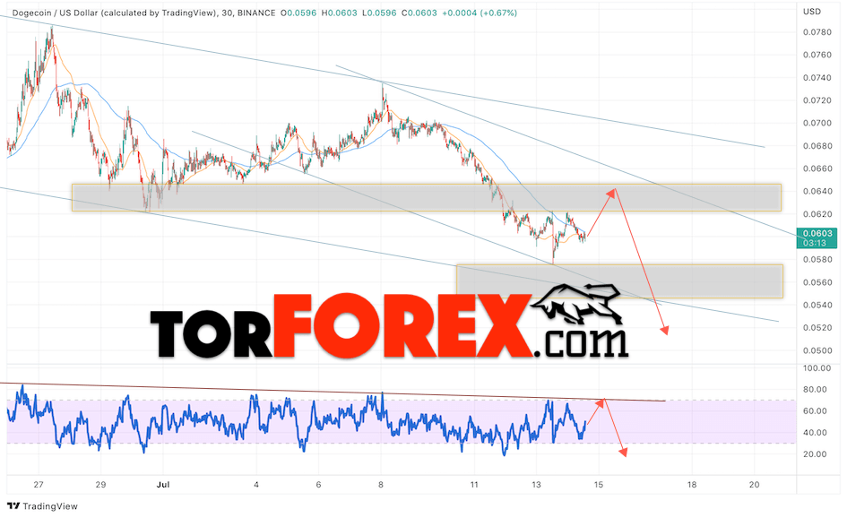 Сильный сигналом в пользу снижения котировок DOGE/USD выступит отскок от линии тренда на индикаторе относительной силы. Вторым сигналом станет отскок от верхней границы нисходящего канала. Отменой варианта падения монеты станет сильный рост стоимости актива и пробой области 0.0695. Это укажет на пробой области сопротивления и продолжение подъёма курса криптовалюты с потенциальной целью выше уровня 0.0795. С пробоем области поддержки и закрытием котировок ниже уровня 0.0505 стоит ожидать подтверждения развития медвежьего импульса по Dogecoin.