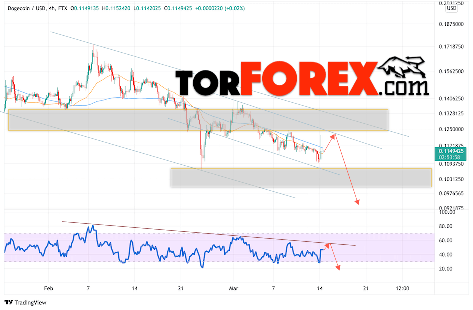 Сильный сигналом в пользу падения котировок DOGE/USD выступит отскок от линии тренда на индикаторе относительной силы. Вторым сигналом станет отскок от верней границы нисходящего канала. Отменой варианта снижения монеты станет сильный рост стоимости актива и пробой области 0.1305. Это укажет на пробой области сопротивления и продолжение подъёма курса криптовалюты с потенциальной целью выше уровня 0.1545. С пробоем области поддержки и закрытием котировок ниже уровня 0.1085 стоит ожидать подтверждения развития медвежьего импульса по Dogecoin.