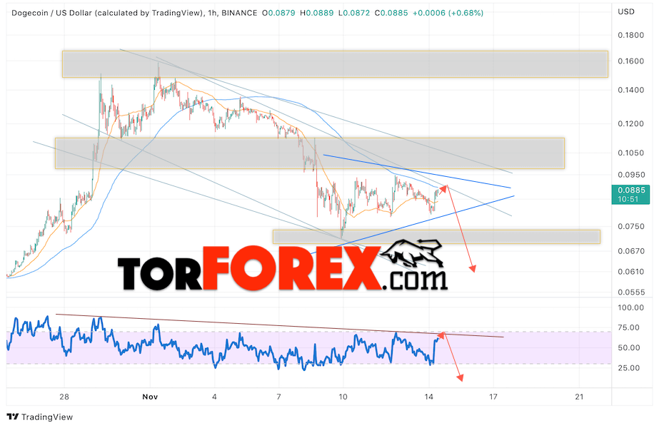 Таким образом, Dogecoin прогноз и курс на 15 ноября 2022 предполагает попытку коррекции и тест области сопротивления вблизи уровня 0.0975. Откуда стоит ожидать отскок и продолжения падения монеты DOGE/USD в область ниже уровня 0.0605. Дополнительным сигналом в пользу снижения Dogecoin выступит тест линии тренда на индикаторе относительной силы. Отменой варианта падения станет сильный рост и пробой области 0.1065. Это укажет на продолжение подъёма криптовалюты с целью выше уровня 0.1445.