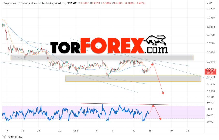 Сильный сигналом в пользу снижения котировок DOGE/USD выступит отскок от нисходящей линии тренда на индикаторе относительной силы. Вторым сигналом станет отскок от нижней границы бычьего канала. Отменой варианта снижения монеты станет сильный рост стоимости актива и пробой области 0.0685. Это укажет на пробой области сопротивления и продолжение роста курса криптовалюты с потенциальной целью выше уровня 0.0945. С пробоем области поддержки и закрытием котировок ниже уровня 0.0545 стоит ожидать подтверждения развития нисходящего импульса по Dogecoin.