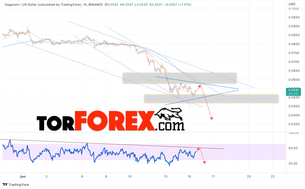Таким образом, Dogecoin прогноз и курс на 16 июня 2022 предполагает попытку коррекции и тест области сопротивления вблизи уровня 0.0585. Откуда стоит ожидать отскок и продолжения падения монеты DOGE/USD в область ниже уровня 0.0365. Дополнительным сигналом в пользу снижения Dogecoin выступит тест линии тренда на индикаторе относительной силы. Отменой варианта снижения станет сильный рост и пробой области 0.0605. Это укажет на продолжение подъёма криптовалюты с целью выше уровня 0.0875.